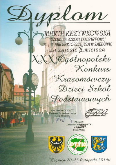 Marta zaprezentowała dwa teksty krasomówcze: "Rikszą po Ziemi Obiecanej" (5 minut) i "Zaproszenie na wędrówkę po woj. dolnośląskim " (7 minut ). Warto dodać, że oprócz drugiego miejsca otrzymała również nagrodę Młodzieżowego Jury . Do pierwszego miejsca zabrakło Marcie jedynie 0,12 pkt. , bowiem najlepiej oceniona reprezentantka woj. Podkarpackiego uzyskała 9,5 pkt. , a nasza 9,38 pkt. w 10 - punktowej skali . Opiekunką Marty była Grażyna Szafińska , która od 2002 r. ma na swym koncie 7 laureatów w tym : 2 pierwsze miejsca ( 2007 i 2008 r.), 4 drugie (2002, 2005, 2011 i 2014 r.) oraz 1 czwarte miejsce (2013 r.). Wśród gości konkursu znaleźli się min. prezes ZG PTTK w Warszawie Roman Bargieł, prezydent miasta Legnicy Tadeusz Krzakowski i przedstawiciele władz oświatowych. Uczestniczącym w konkursie uczniom i ich opiekunom zapewniono szereg atrakcji jak np.: zwiedzanie z przewodnikami miasta Legnicy, wieczór jubileuszowy z degustacją tortu, seans filmowy dla uczniów i spektakl w legnickim teatrze dla opiekunów, a we Wrocławiu zwiedzanie nowo otwartego jedynego w Polsce afrykarium