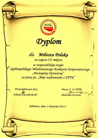 kapituły w 2014 r. Pan Włodzimierz Szafliński Prezes Polskiego Towarzystwa Turystyczno – Krajoznawczego Oddział w Żarnowie.