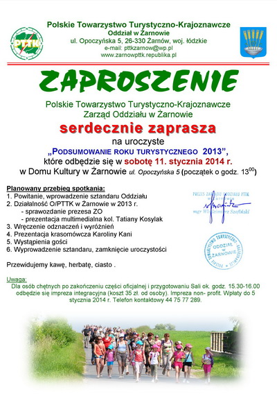 W czwartek 5 grudnia 2013 r. w Domu Kultury w Żarnowie odbył się Nadzwyczajny Zjazd Oddziału. Wzięli w nim udział delegaci wybrani na V Zjazd Sprawozdawczo - Wyborczy , który miał miejsce 12 stycznia ub. r . Jednym z ważnych elementów było wręczenie legitymacji i odznak PTP i IOP nowym członkom kadry programowej Oddziału . Uprawnienia przodownika turystyki pieszej otrzymali Magdalena Szołowska i Rafał Kozak , natomiast duża grupa otrzymała uprawnienia instruktora ochrony przyrody . Byli to: Elżbieta Ciszek , Barbara Dukat , Stefan Mirosław Grabski ,Rafał Kozak, Sabina Kubiszewska , Ewelina Stasiak i Elżbieta Zając . Również była okazja do poinformowania zebranych o rozszerzeniu uprawnień przodownickich na województwo świętokrzyskie przez kol. Adama Cygana i Wojciecha Dziubę . Zjazd podjął uchwałę o przyjęciu Statutu PTTK jako obowiązującego dla Oddziału w Żarnowie , który jest jednostką terenową Towarzystwa . Jednocześnie delegaci uchylili dotychczas obowiązujący statut Oddziału . W Nadzwyczajnym Zjeździe Oddziału w Żarnowie wzięło udział ponad 70 % uprawnionych delegatów