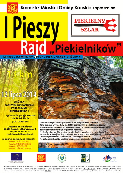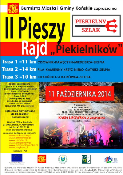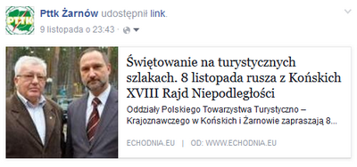 Od 18 lat Oddziały PTTK w Żarnowie i Końskich organizują wspólnie Rajd Niepodległości, którego tegoroczna edycja odbyła się 8 listopada br. na dwu trasach pieszych 7 i 14 km z miejscowości Niebo przez Piekło do Sielpi Wielkiej . Na starcie zgłosiły się drużyny reprezentujące szkoły podstawowe i gimnazja z Aleksandrowa, Białaczowa, Miedznej Drewnianej, Petrykóz, Skotnik, Szczercowa, Przedborza i Żarnowa. Wśród około 280 wędrujących turystów 160 było z woj. Łódzkiego, pozostała 120 osobowa ekipa pochodziła z woj. świętokrzyskiego . Celem rajdu jest uczczenie rocznicy odzyskania przez Polskę niepodległości po 123 latach niewoli , poznanie Ziemi Koneckiej , promowanie turystyki pieszej i integracja turystów z różnych szkół i miejscowości . Tegoroczna impreza była kontynuacją ogólnopolskiej akcji zainicjowanej przez Komisję Turystyki Pieszej ZG PTTK pod nazwą " Początki drogi ku niepodległości 1914- 2014 " , w której PTTK w Żarnowie ma swój znaczący udział. Podczas uroczystego zakończenia rajdu w pensjonacie " Komunalni" w Sielpi, odbył się występ uczniów SP i Gimnazjum w Żarnowie z programem słowno - muzycznym pt. "Pamięć " przygotowanym pod kierunkiem Grażyny Szafińskiej i Adama Boćka. Wiązankę pieśni patriotycznych wykonał zespół gitarzystów " Gamma " z żarnowskiego gimnazjum . Zarząd Oddziału PTTK w Żarnowie przekazał współorganizatorom rajdu okolicznościowy puchar za 18 lat współpracy rajdowej. Prezes Oddziału PTTK w Końskich Wojciech Pasek wręczył z kolei żarnowskiemu Oddziałowi medal z podobizną Jana Małachowskiego - kanclerza wielkiego koronnego - założyciela miasta Końskie . Odznaki turystyki pieszej otrzymali: Miłosz Polak i Rafał Nicoś - brązowe oraz Jacek Borawski i Patryk Wośko - popularne . Wręczono także legitymacje członkowskie Julii Jabłońskiej, Jakubowi Kozińskiemu , Damianowi Osowskiemu , Mateuszowi Wojciechowskiemu, Martynie Szulc i Klaudii Ślusarczyk . Pamiątką z imprezy będzie dla każdego odznaka rajdowa , a dla drużyn dyplom uczestnictwa . Mimo deszczowej aury towarzyszącej piechurom kolejny XVIII Rajd Niepodległości uznać można za udany i dobrze służący wychowaniu patriotycznemu dzieci i młodzieży szkolnej .